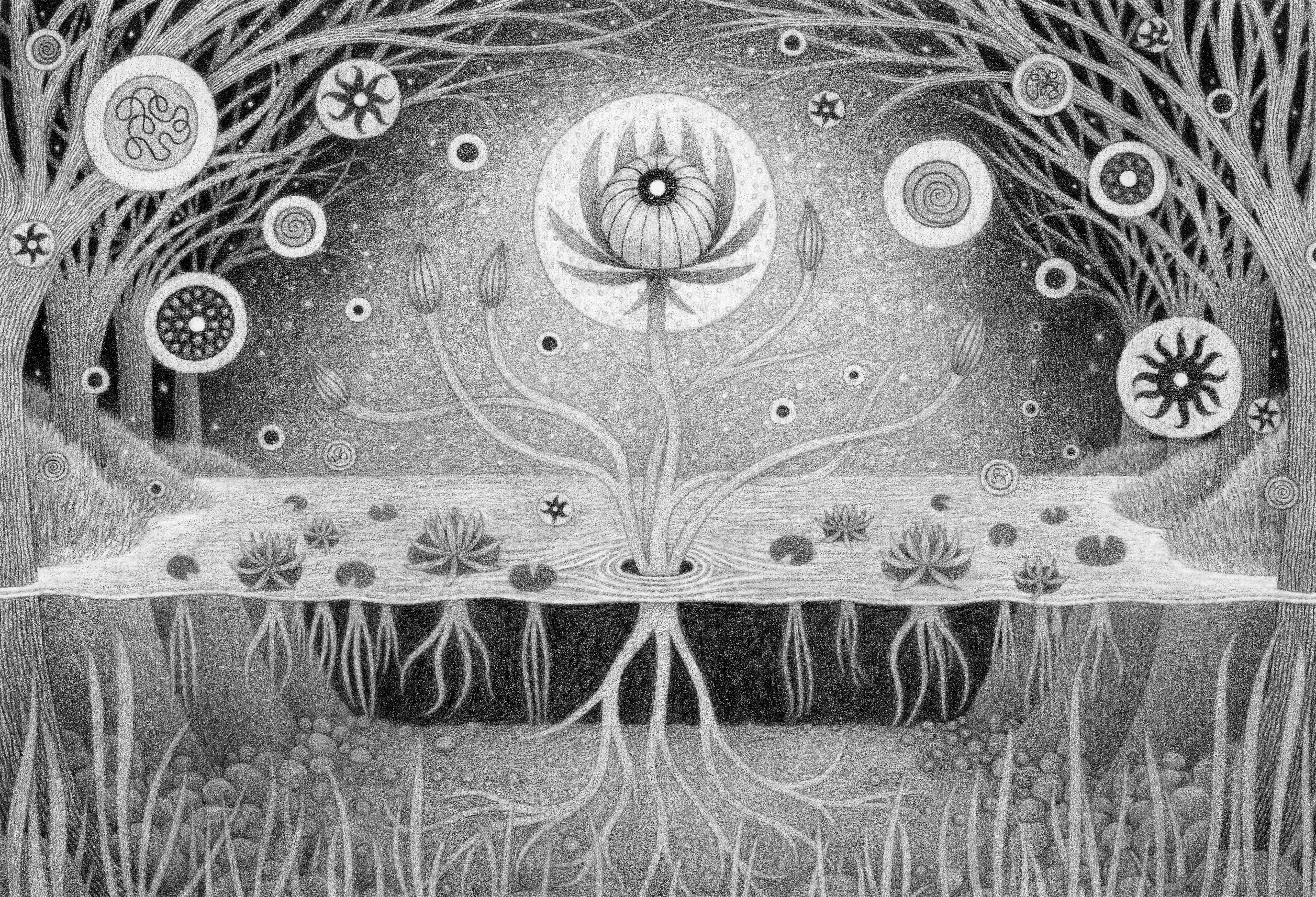 Cosmic Garden. 2025. Ink and graphite on paper. 12cm x 12cm each.